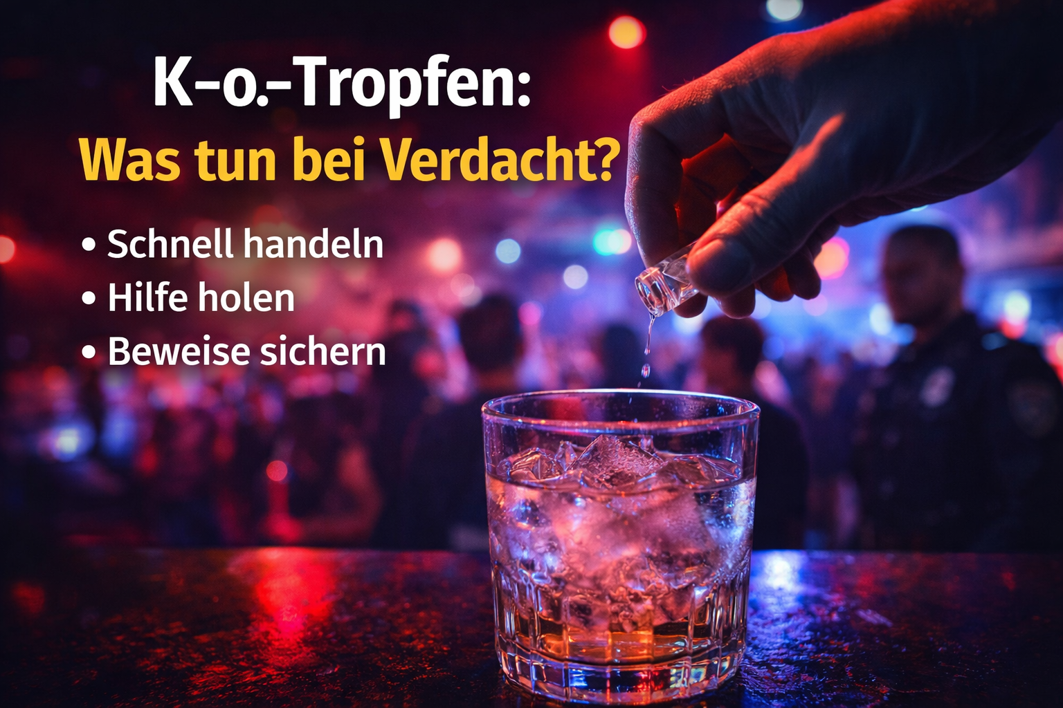 Bei Verdacht auf K.O.-Tropfen gilt: sofort Hilfe holen, klar kommunizieren, nicht allein bleiben – und bei ernsthaften Anzeichen Beweise frühzeitig sichern.